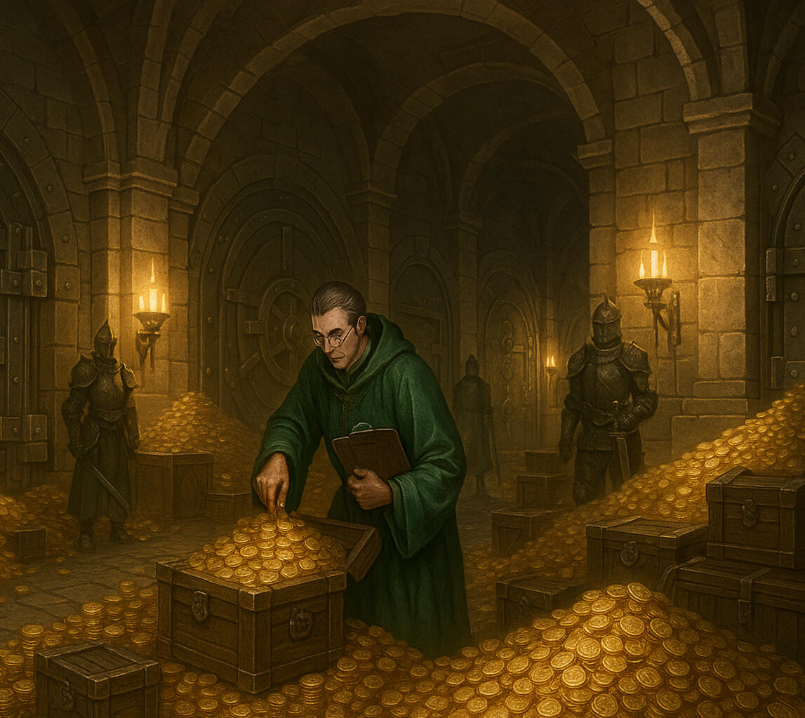 Managed by Archledger Thémier Granzelant. All applications to open an Eternal Vault of your own should be directed to the Archledge directly.Situated in an undisclosed location, and accessible by authorised individuals only, the Eternal Vaults hold a sheer fortune of gil which helps the Bank finance its various projects and investments. New members are allocated an Eternal Vault when they join up to the Dragonspire Bank and their savings, bonds and investments are securely stored within until such time that they need them.The Eternal Vaults are the ultra-secure, long-term asset preservation chambers. Officially, they are classified as Tier-0 Archives, inaccessible without dual directorate authorisation, containing holdings deemed too valuable, sensitive, or ancient to circulate through regular banking infrastructure.They are not simply storage; they are financial sanctums, housing the forgotten, the generational, and the deliberately dormant.To facilitate day-to-day transactions, gil is constantly moved between the Eternal Vaults and the primary banking building. Managed by a secure and robust staff, guarded heavily at all steps of the process, funds are collected and transported by an unknown method.